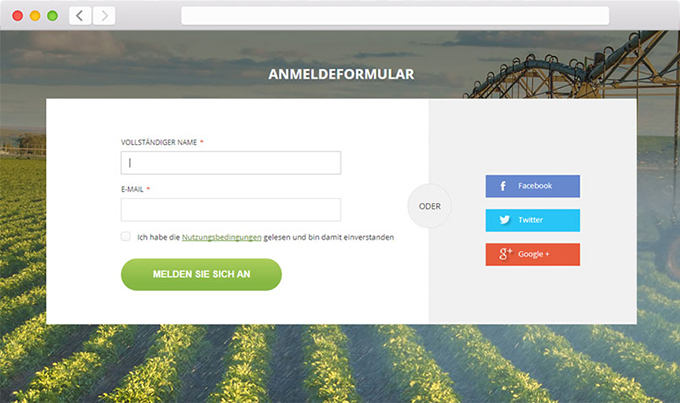 Geben Sie auf der Registrierungsseite des neuen Benutzers Ihren Namen, E-Mail-Adresse. Lesen Sie aufmerksam die Nutzungsbedingungen der Webseite durch und stimmen sie zu. Außerdem haben Sie die Möglichkeit, sich mithilfe einer der sozialen Netzwerke anzumelden.