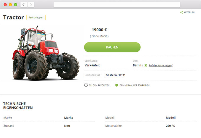 Die ganze Information ist auf der Seite des Produktes/der Dienstleistung verfügbar: Fotos, Beschreibung, Eigenschaften. Machen Sie sich mit den Zahlungs- und Lieferungskonditionen bekannt, vergewissern Sie sich, dass das Produkt in Ihre Region geliefert werden kann.