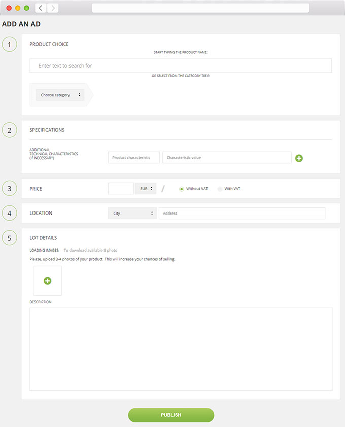 On the page for the adding an advertisement, select the type of your advertisement, carefully select the section, where your advertisement should be located, fill in the necessary characteristics of the goods, units of measure and quantity of goods, price, photo, description of your product/service.