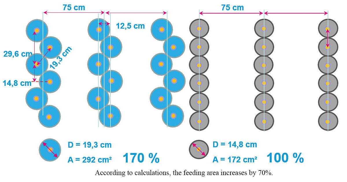 The main feature of this machine is the innovative seeding technology DeltaRow .The principle is based on sowing seeds not in a row, but with a shift, in chessboard order. The seeds, which are located in this way, receive a large feeding area. The plants overlap each other less in comparison with the usual wide-row sowing. As a result, there is no contest for light and moisture, which positively affects on the yielding ability.