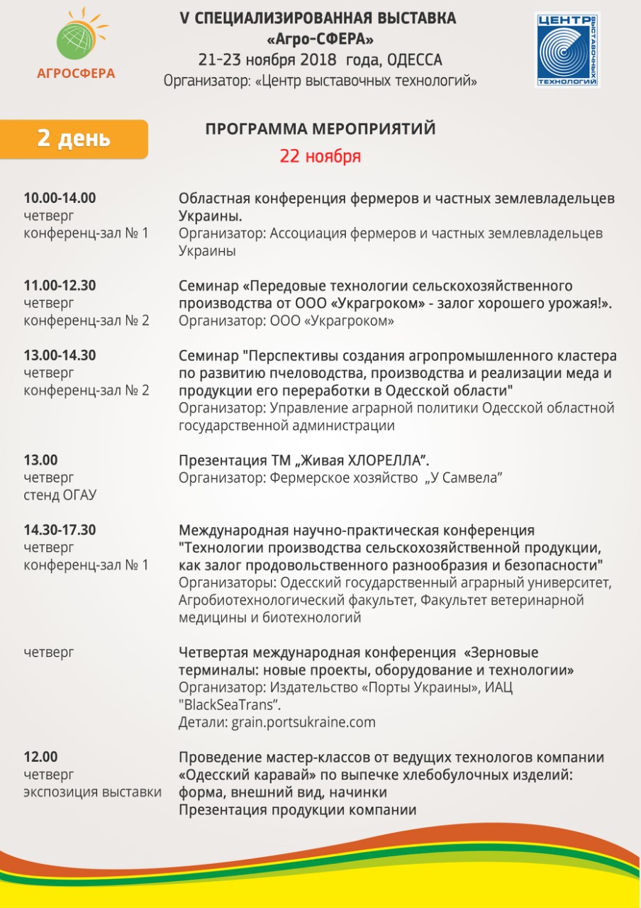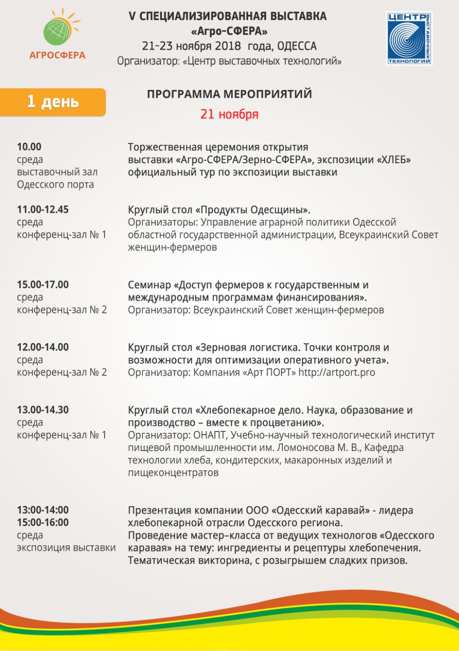 «Ключевая тема экспозиции и направления дискуссии - специализированное мероприятие «ЗЕРНО-СФЕРА. Украина». В период выставки издательство «Порты Украины», ИАЦ «BlackSeaTrans» проведут четвертую международную конференцию «Зерновые терминалы: новые проекты, оборудование и технологии», – пишуть організатори.
