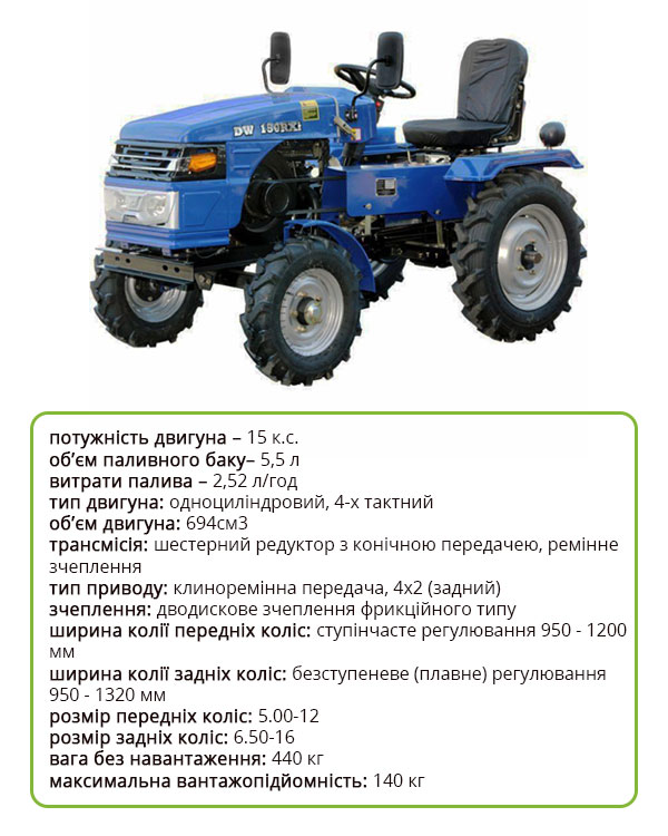 Еще один представитель этой категории – минитрактор DW 150RXI. Он имеет одноцилиндровый двигатель объемом 694 см3. Этот показатель меньше, чем у предыдущего мототрактора. Однако DW 150RXI на 100 кг легче – всего 440 кг без дополнительной нагрузки. В нем экономнее расход топлива – 2,52 л/час. Заводится эта модель с помощью электрического стартера. В комплекте есть аккумулятор, но в случае необходимости, трактор можно завести ручным стартером. Цена – 43 173 грн.
