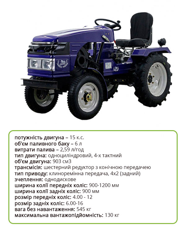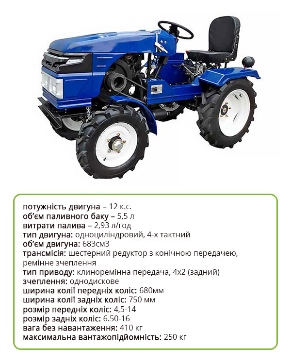 Из Китая также поставляют недорогой мототрактор – Булат Т-120. Мотор обладает мощностью 12 л.с. Трансмиссия имеет шесть передач переднего хода и две -заднего. Грузоподъемность заднего гидравлического подъемника – 250 кг. Благодаря своему небольшому весу, минитрактор является маневренным, но в отзывах пишут, что его мощности иногда не хватает для тщательной обработки земли. Цена – 41 800 грн.