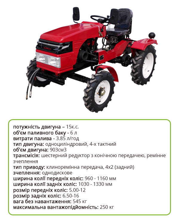 Большой выбор минитракторов предоставляют китайские производители. Первым в списке идет дизельный Forte МТ-161 с двигателем мощностью 15 л.с. Такой двигатель имеет жидкостную систему охлаждения, а также запускается с помощью ручного или электрического стартера. Благодаря гидравлической системе можно быстро установить необходимое оборудование. Как и во многих подобных тракторах, у этой модели – задний привод. Его цена – 56 806 грн.