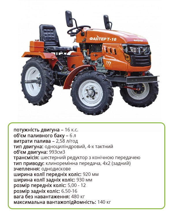 Файтер Т16 – новейший бюджетный мототрактор мощностью 16 л.с. В объявлениях на нашем сайте его стоимость составляет 49 900 грн. Двигатель, установленный в этой модели, имеет простую конструкцию. Он одноцилиндровый, расположен горизонтально, его объем – 993 см3. Коробка передач от мотоблока. Выхлопная труба в этой модели выведена под двигатель. Таким образом, выхлопные газы отводятся от водителя. Кстати, такое размещение выхлопной трубы встречается среди минитракторов довольно часто.