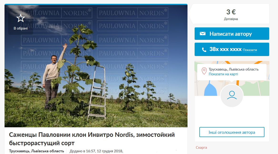 «Во Львовской области, под Дрогобычем, есть плантация Paulownia Clone In Vitro 112®. Недавно было обнаружено, что именно эта площадка используется в промороликах компании «Павловния Захид» с акцентом на то, что это их клон. Показывая деревья, представители утверждают, что это Paulownia Nordis, тем самым вводя людей в заблуждение».