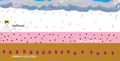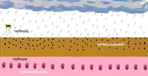 При таких условиях препарат проникает в верхний слой почвы, где находится основная масса сорных семян. Вместе с влагой к росткам сорняков поступает и гербицид, в результате чего ростки погибают.