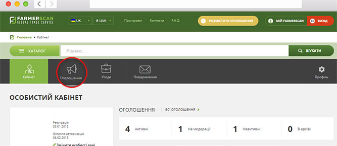 Якщо у Вас знову з’явився цей товар, Ви можете активувати старе оголошення. Для цього натисніть кнопку «Мій Farmerscan» для переходу в свій особистий кабінет і виберіть розділ «Оголошення».