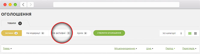 Натисніть кнопку «Не активні» і наведіть мишку на оголошення, яке потрібно відновити.