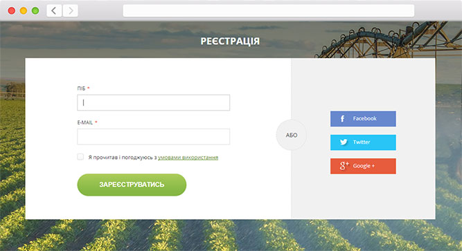 На сторінці реєстрації нового користувача вкажіть Ваше ім'я, адресу електронної пошти. Уважно прочитайте умови використання сайту та погодьтеся з ними. Також, у Вас є можливість пройти реєстрацію за допомогою однієї з соціальних мереж.