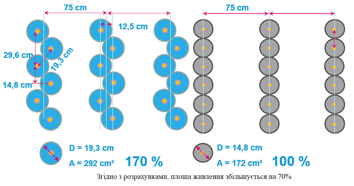 Здійснюється такий прийом за рахунок незвичайної конструкції висівного апарату. Пара синхронізованих висівних дисків по черзі подає насіння в два сошника секції. Таким чином, 8-ми рядна сівалка фактично висіває 16 рядів.